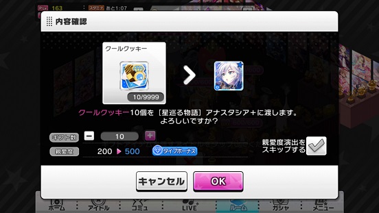 まず各色クッキーを10個ずつ買う。それに加え今まで貯めていたものも含めて一気に親愛度を上げる。優先度はSSR>SR。Rはもう所有するもの全て上げきったはずである。