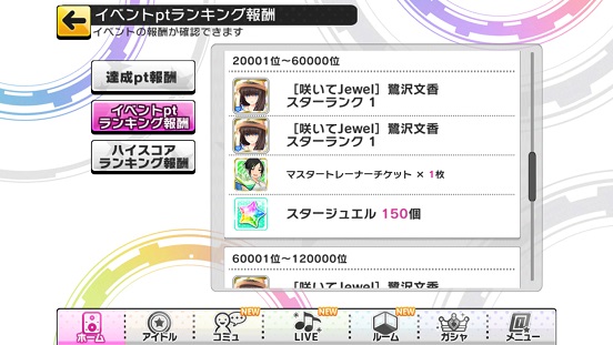 最近デレステする人が多くなった?のかまさかの下限が伸びる。つまりいわゆる幸男ラインが120001位になった。限定SRを手に入れるのが一応楽になった?ただし、20001位より上は変更していないので結局上位の方が激戦になるのは今まで通り。