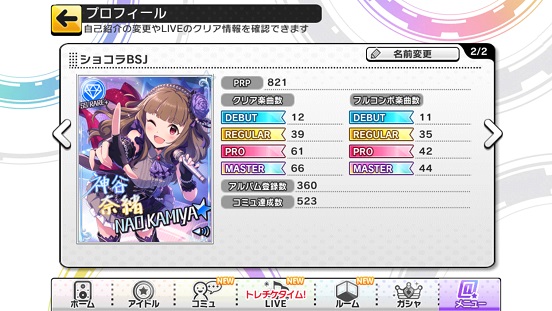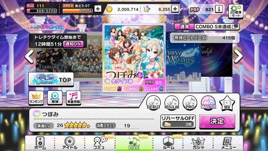 クリア66に対して、フルコン44。つまりちょうど2/3フルコンという状態。フルコンしていない曲だけやってどこまでフルコンの数が増えるかな?しかし、今残っている曲は滅茶苦茶苦手な曲が多いためそうそうできないでしょう。もし、0で終わったらごめんね、奈緒坊。どうでもいいですがPRPは821。今のところスカウトチケットのみ5000円課金でこのPRP。ミッションに900目指す奴有るけど、これ微課金・無課金じゃフルコンでも無理だろw