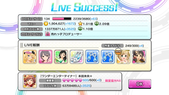 これでまさかの貢献度3位。フルコンは私だけだったのにね。多分特技レベルとかポテンシャルのせいか?最高得点をたたき出したのにね。あと属性違いの人だけフルコンしたが、5位とか。