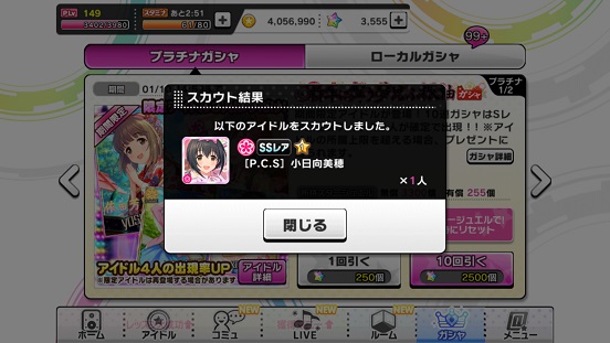 なのでCuのみまだしていないということ。もう一つはCuの手持ちが最も少ないというのもありCuの誰かという風に決定。そしてCuの中で誰が一番いいか?というのに対して小日向さんになった。というか能力もかなり強めの4秒系のスコアアップなので重宝するかと。