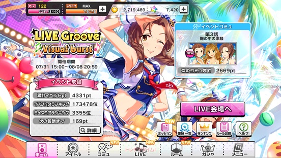今回はまだ育成し切れていないSRアイドルを中心にGROOVEを回したいと思います。今回の曲、サマカニ!!は難しいので80万以上行ければいいかな~今回は銅トロフィーでも取れたらいい方だな!
