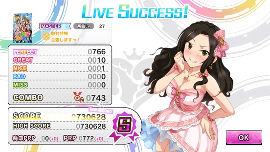 かなり惜しかった…というか処理落ち発生してniceになった…だけど、最後の方だったからまだよかったなあという感想。これが中盤とかだったら最悪の一言。これでなんとか銅トロフィー圏内には入れたかも。銀はフルコンでも厳しそう。SSR90%(せめて全部30%)アップがいないため余計にきつい。いつか銀以上取りたいけど、SSR以内ときつい!完全無課金を貫くつもりなのでしょうがないかも。