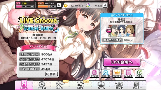 イベントポイントも高めだが、ハイスコアが3427位。なんでこんなに高いかって。MASTER+できたんだよ。まさかのね。まあ今3400位くらいだが正直私も限界なので流石にこれ以上は無理かなあ…というか後は下がるしかなさそうなのでな。なので金は厳しい。120万でやっと安心レベル。それでも多分久々の銀トロフィーいけるかもという。