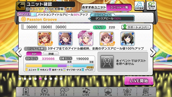 いかんせん2人しか属性一致がいないのかかなりぶれる&アピール値が特化型より損という感じ。それでも最高の33万。トリコロール2人使用。