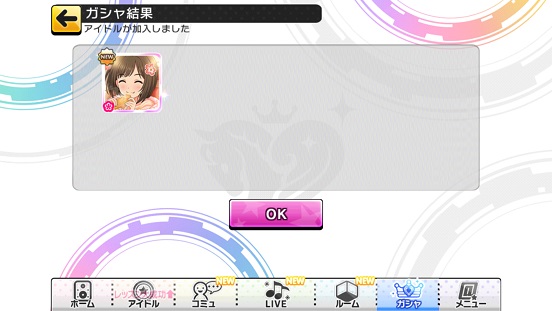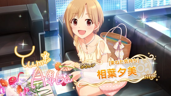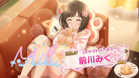 つまりシンデレラフェス直前の最後のガシャで来た。軽いロードだったから持ってないSRかと思ったがふたを開けると青刺繍。1度キャッシュ消しているのでもしかしたらカブリかも…と思いつつ引いたらみくだった。もちろん持ってない。多分ゲスト・協力ライブとかでいくらかロードされていたか?