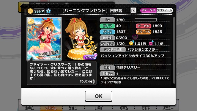 気になるSSRなのですが、能力は以下の通り。どうも回復系ですね。あんずとかやみのまやる時は重宝するかも。私もいまMV解放のためにMASTERしてますが、これは助かりますね。イベントとかで(下手でも)最後まで突っ走れる可能性が非常に高くなります。