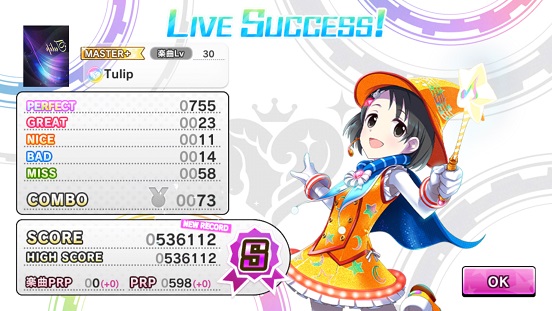 ちなみにプレイスタイルはMASTERでぶん回し、アンコールもMASTER。だってMASTER+は史上最凶譜面であるがゆえにあまりにも安定しない。設定5のスロットの如く滅茶苦茶な結果になりそう。初めてしたときはライフ0の間際に川島ガードと涼のヒールが一気に稼働して失敗を免れたし。