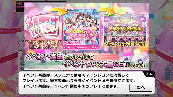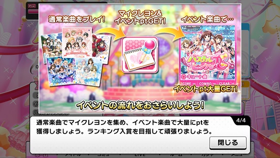 まあいうなれば冬にあったSnow Wings形式と同じです。通常ゲーム(いつもの楽曲)をプレイして、マイクレヨンが貯まったら、ポイントが一気に入るフリーゲーム(パステルピンクな恋)をプレイしましょう。今回もSnow Wings同様2倍消費が選べますが、経験値とかを考えたら極力1倍でする方がいいです。