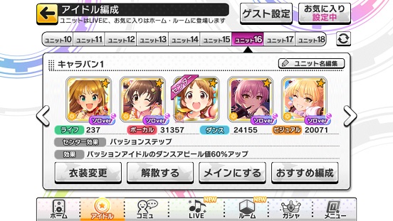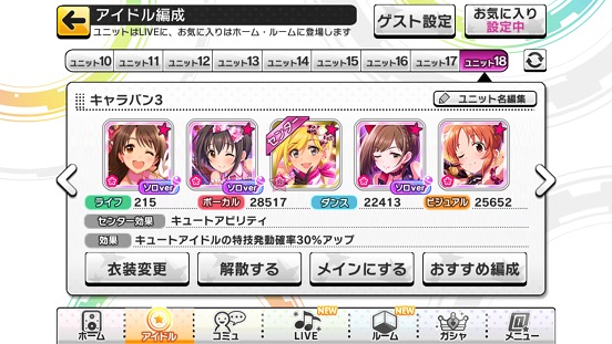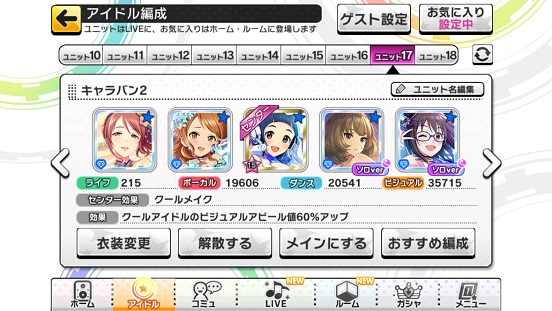 なぜ2つに分けているかというと元々VRの曲だったため。VRとデレステではメンバーが異なる。そして全属性アタポン&全属性プリンセスが出たためハイスコアが銅でも100万超えた。Coのみスキルブースト(チート)があるためもっと高いはず。銀なんて120万やぞ…どうやっても119万とどまりだったので諦めた。というか2回目のハイファイ組というのもあるのでもう一度デレステユニットが出ることがあるかも。