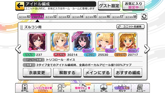 「つぼみ」相葉夕美SR(9秒スキル特技10)なので2人のみでもほぼ行ける。一応保険に限定志希(9秒スキル特技6)なのでパッションならほぼオーバーロードが発動する。当然ながら体力が相当削られるので限定SSR茜(回復でライフ10特技6)を入れないとOUT!1人は入れる。