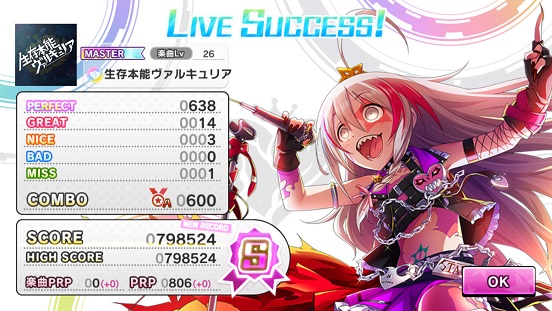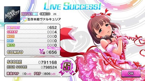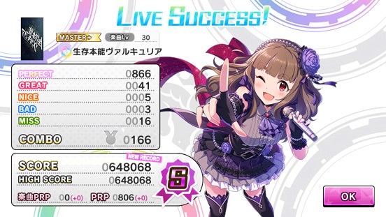 というわけでもう適当にします(笑)MissやNiceが多いけど、実はNiceは夕美のオーバーロードで全て打ち消したwまあSSR茜がいるので安心してオーバーロード使えますね。実はオーバーロードはSSR並のスコアアップとSSRニュージェネレーションズの判定強化(NiceとBADをパーフェクト扱いにする)を兼ね備えるのでかなり強力。その代わり体力を消費するけど。でも回復かガードで防ぐことができるとのこと。でも体力を消費って言ってもフルコンできる人なら問題なく使えそう。