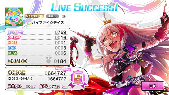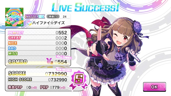 MASTERに至っては初見フルコン。なんじゃそりゃ。拍子抜け。これじゃあハイスコアが異様に高くなることが容易に想像できる。ちなみに上の73万は適当な育成ユニットでしたため、これで73万行くのだから