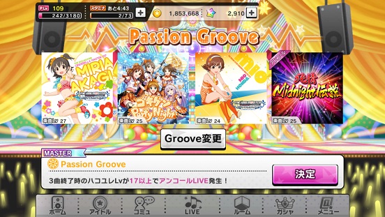 今日はこんなところになるな。今回のGrooveは仕事が忙しくてあまりできそうにないかも。残業も多いのわかっているし。その代わりシンデレラフェス来たら残業代でも使って課金を再びするかもねえ。気分次第で(笑)