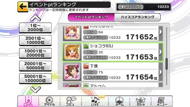 イベントポイントは171653位。10000程度だとそんなもんか。