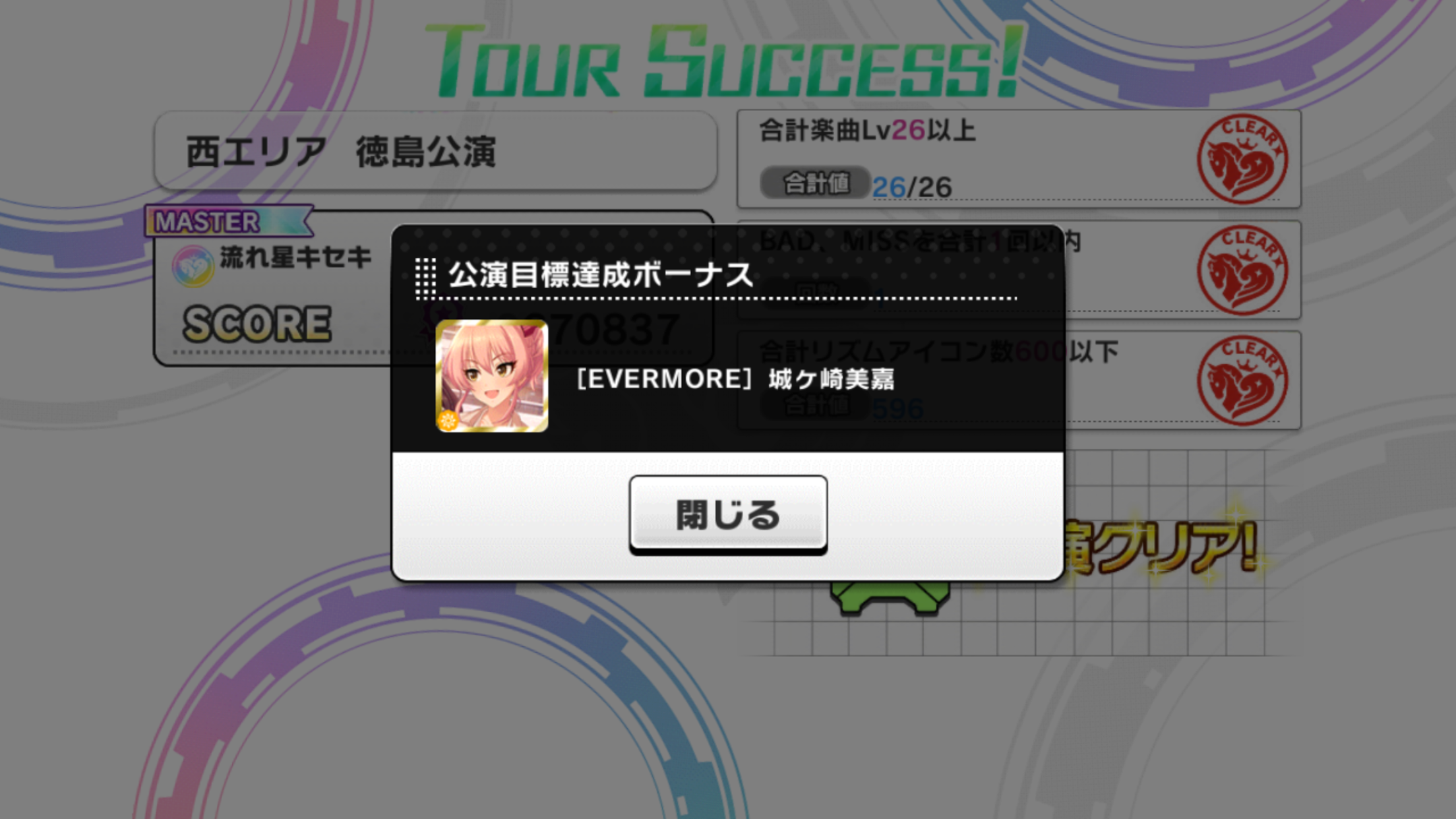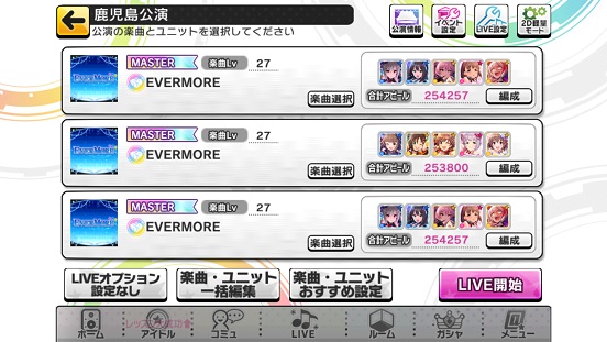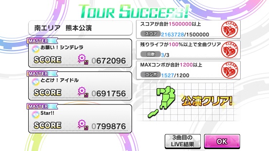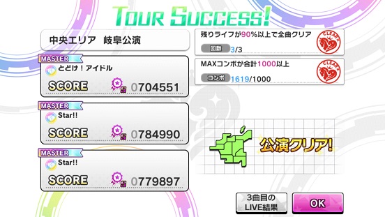条件は2曲フルコン・合計70レベル・ライフ90%残す内容のため、とどけ!アイドル3連はレベル上不可。