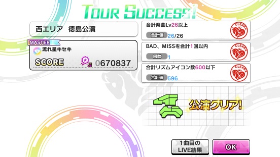 ノーツが600以下である。加えBAD以下1つまで。流れ星で乗り切ったが、フリックミスで1回。絶対的9人はノーツが600超える。お星さまはレベルが25なので×