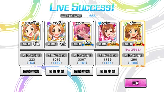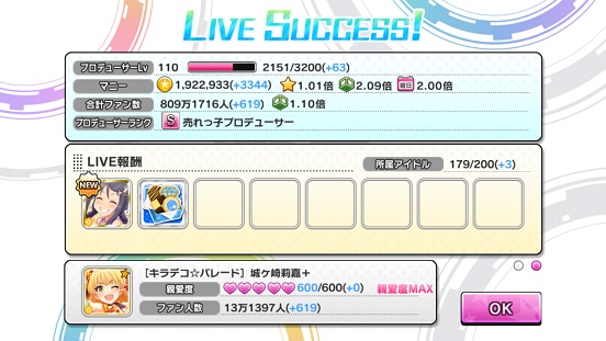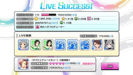 それと、1位になっても普通にRアイドルが出なかったりすることがあるんだが…上の奴が一番最高だったはず。ちょっと今回出にくいなあ…トレーナー系はドロップが多いからありがたいが。