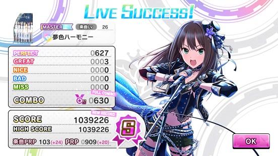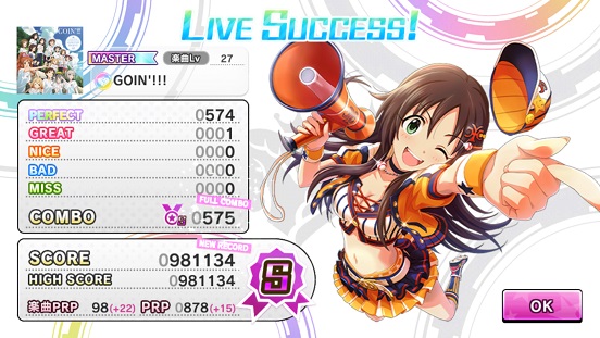 1つはGOI'N!!!これは全属性27では初。というかこれしか27ないけどさ。正直ゲストとか適当にやっていたのにこの得点には驚いた!PRPを15更新。多分ちゃんみおのコンボボーナスのおかげ(特技レベル9)
