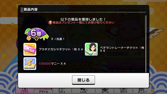 宝くじはSRスカウトチケットももらえない最高6等の結果に…そんなもんか。多分平均より悪いと思う。まあこれに関しては色々賛否両論であり、中には1等への凄まじい嫉妬のツイートも…1等の人は公表しない方がいいかもね。