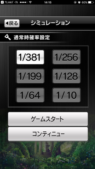 確率は課金なしで色々選べ、1/381(普通の確率)1/10(ほぼすぐ当たる)まで選べる。とりあえず普通の1/381から開始。GODでいうなら凱旋設定4(1/371)くらいでしょうか?
