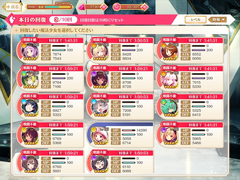 とにかく手持ちのレベル80以上の魔法少女を全員フル稼働させてクリア。普段使わない子もどんどん起用できたのはかなりいいイベントだと思った。ただ、死にまくり。