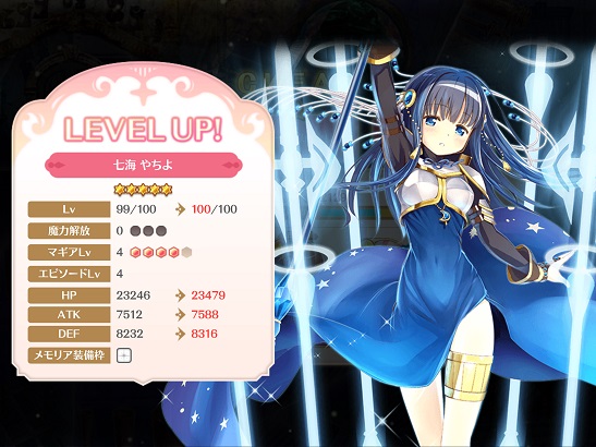 やちよもレベル100に到達し、あとはマギアレベル5にしてドッペル開放するのみか?それと久々にメモリア☆4出たなあ。それも2枚。