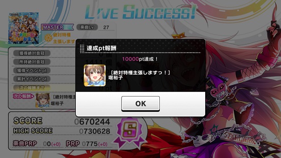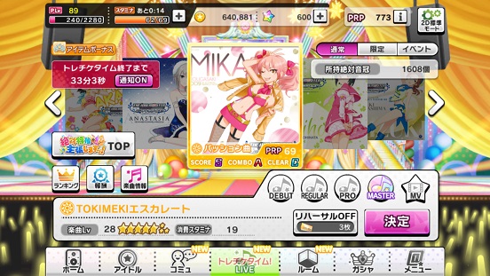 ようやく10000pt突破。ユッコ1枚目。そして音冠がいまだに1400近くある。今回全て1倍で行っています。というのもアップデートによりレベルアップでのスタミナ全快で損しにくくなったので1倍でやったほうがスタミナを無駄なく使えること。それとSSRきのこさんの経験値溜め。そろそろ×2や×4でやろうと思ったが、今度はユッコとかが来たのでまだまだ1倍で耐える。