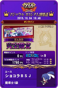 今日はメダルゲームをあまりしてなく、友人と交代でQMAをプレイ。プレイは言うまでもなくマジックコロシアムです。また、今回対戦相手が変わっていました。ドクラーケンになっていました。交代しながらも協力してプレイをしたのですが、なんとほとんど負けました…たしか友人のも含めて15回くらいして12回負けるという散々な結果に。勝ち方もぎりぎりで最後の攻撃で何とか撃破という状態に。バランス・正答率もかなりいいのにぎりぎりだったときもあるので敵のパラメーターを下方修正してほしいと願うばかりです。私のカードでは6回行いましたが5回も負けました。なんか明らかに勝ってないなあ…