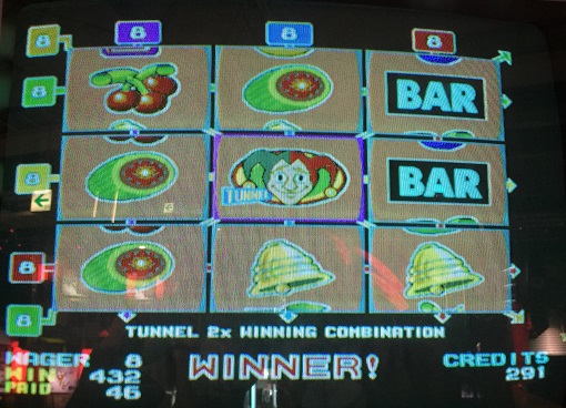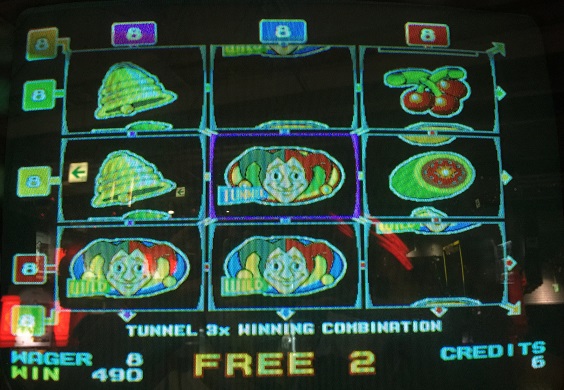 なんとJOKERが3つも来ました。すべてのANY3が加算されるため強力な手に!ベルのANY5もいいですね。ただ、JOKER2つある隣がブランクなのが悔やまれますが。608winなのでコレクト。その後も遊び、