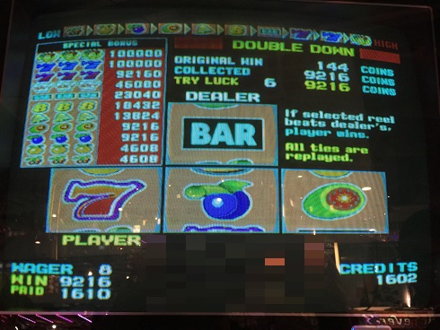 ARUZE機は1000枚以下は全て叩きのため944を一気にダブルに賭ける。そうするとDEALERが8と強くて負けを覚悟したのだが、