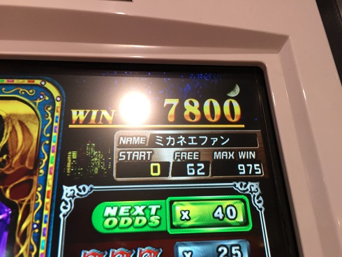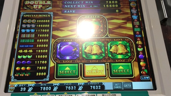 3回目が蜜柑…普通なら喜ぶところなのだが、経験上結構な確率でDEALER蜜柑に対しチェリーで負けている。しかも今日だけで4回負けているためKONAMIの罠だと思い負けを覚悟して叩いたらベルで事なきを得て7800枚になった。ちょうど200倍となった。