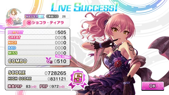 というわけではっきり言ってどうなるかまだ不明。なんかMASTER+がかなり難しいとか。今回幸いCOOLなのでフルコンできたらトロフィーくらいは行けるだろう。でも最近ポテンシャルとかMASTER+が当たり前のように出ているため、銀以上ははっきり言ってかなり難しい。というか並の実力及び課金では不可能な領域に…