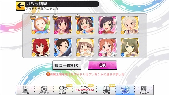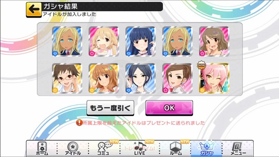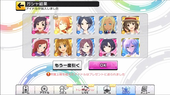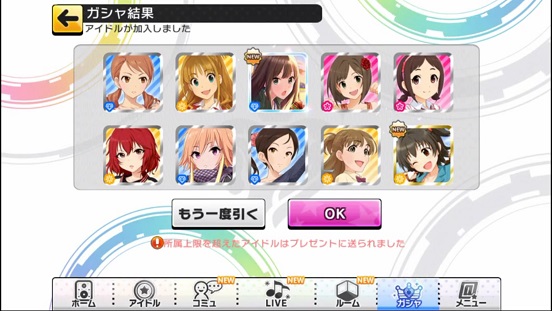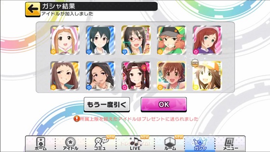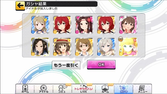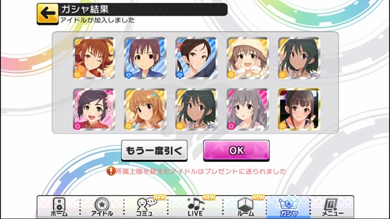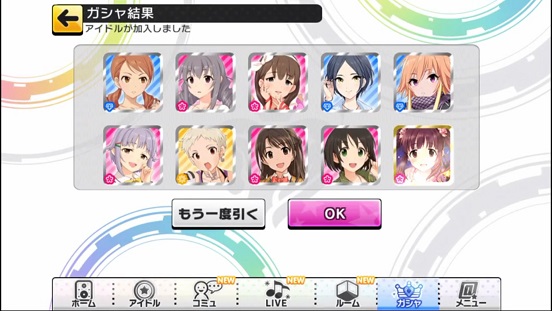 一応こんな感じになった。まあSSRは期待値以上に出現したのでいい感じだろう。しかしちゃんみお3人被っているのと蘭子の2被りはきつい。でも期待値以上に出たからおk。しかし限定しまむーは残念ながらスカウトできなかったが、仕方ないか。恒常は来たけどw