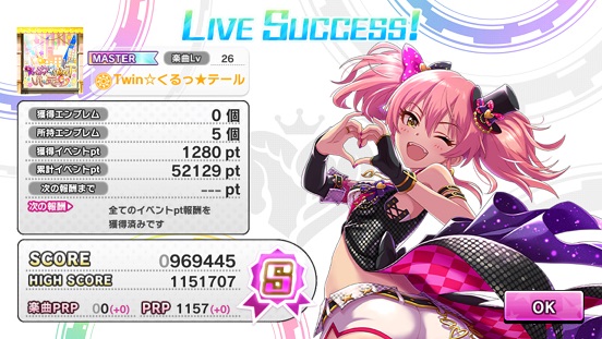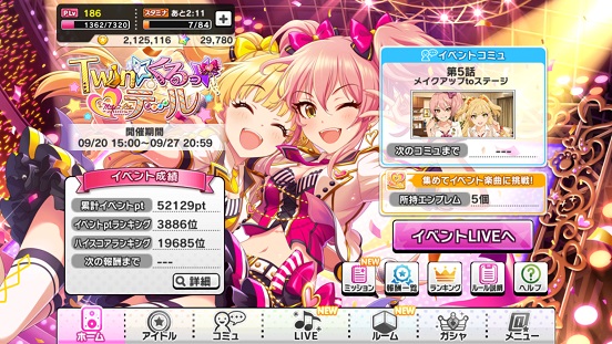 最終的に52129ptで終わり。イベントpt報酬も初めて全て獲得した。エンブレムも5個だけなのでちょうどいい感じに終わった。そして所持していた全てのドリンクを使い果たす。担当イベントなんとかやり切った。スタミナも漏らさないようにした。