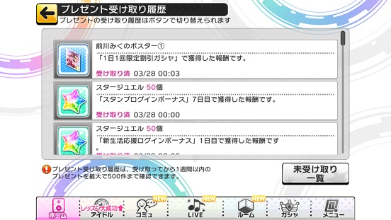 SRに関してはほぼ期待値通りの結果(9枚)SSRは期待値1枚を超えたのでいいと思う。ちなみに前川さんが来たのは画像見てわかる通り3/28…