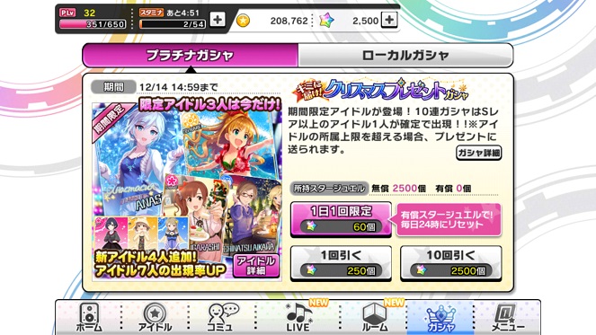 デレステ初めて約1ヵ月になりますが無課金状態で再び2500貯まりました。MASTERをクリアしてきましたので割と早めに貯まりました。早速、SRは確定の10連ガシャに向かいます!