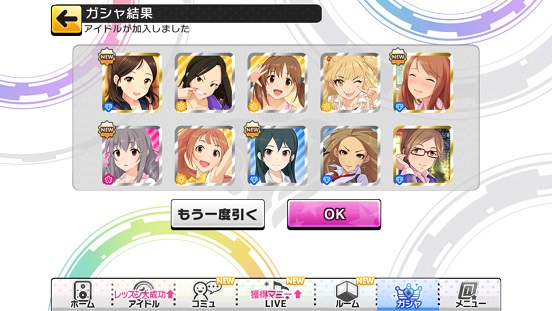 ちひろはこれで以上。次にガシャ。ローカルはマスタートレーナーが出現。プラチナはSSRが2倍。と言ってもどっちもかなり低確率には変わりない。ローカルはこういうことがあろうかと、