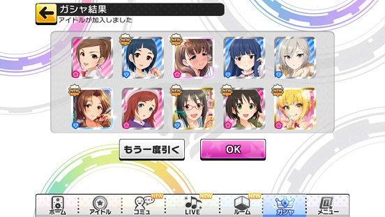 大体新規SSRがシンデレラフェス(1.5%→3.0%)でもないのに一気に2枚ってなあ。しかも新規SRも2枚。つまりこれらを最高レベルまでするのはかなり時間がかかるな。うれしいけど大変そうだ。さらに