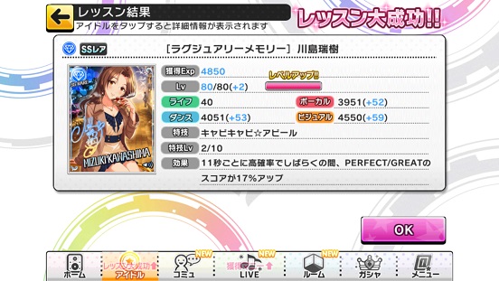 特にまゆ&川島さんなんて600も上げる必要があるので相当数回数をこなす必要あるな。ヤバス。しかもSRも4枚だし一体何回やりゃ全員MAX&MAX深愛度になるんでしょう。うれしいが大変だなおいィ!