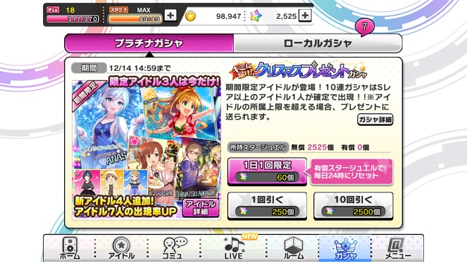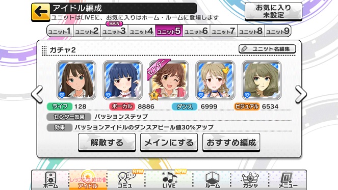 唯一の課金要素といってもいいガチャですが、この内容がLIVEの成功及び得点等に関わってきます。