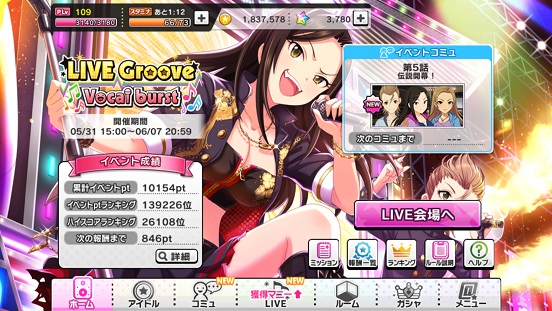ようやくSR里奈を手に入れる。ただ今回はイベントポイントは壊滅的なので目標は思い出のカギが取れる12000点。ここを目指したい。