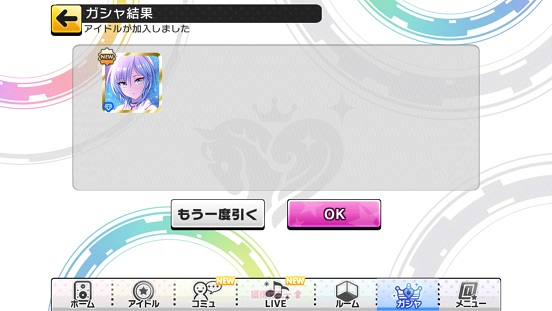 ローカルガシャでついにSRアイドルを引く!しかも持っていないSRアナスタシア。正直ケツが浮いたわ!ローカルガシャでも引けるもんだなあと。これからはローカルガシャにも期待したい。でもプラチナガシャのSSR引くより難しいんだろうな。