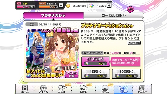 シンデレラガールにもなったことのある十時愛梨の恒常SSRの投入。これはやべえな。すごく人気のあるアイドル。過去に限定だったので十時さんが好きでも手に入れられなかった後発組もいるはず。