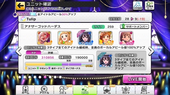 曲はTulipのものだが、発揮値はなんと31万超え!しかもSR1人いるのにね。しぶりんとSRちゃんみおがコンボボーナス、残りの3人がスコアアップとなっている。センターのしぶりんは特技レベルMAX10!