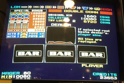 振り切り直前にBAR揃いのスペシャルボーナス。2度目の万枚獲得(126倍)その後