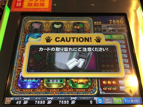 7ラッシュ中に3840&6000WIN獲得。といっても7が揃ったりしてこの当たりになったわけでなく当たった分をダブルアップしてこの枚数になっただけという。